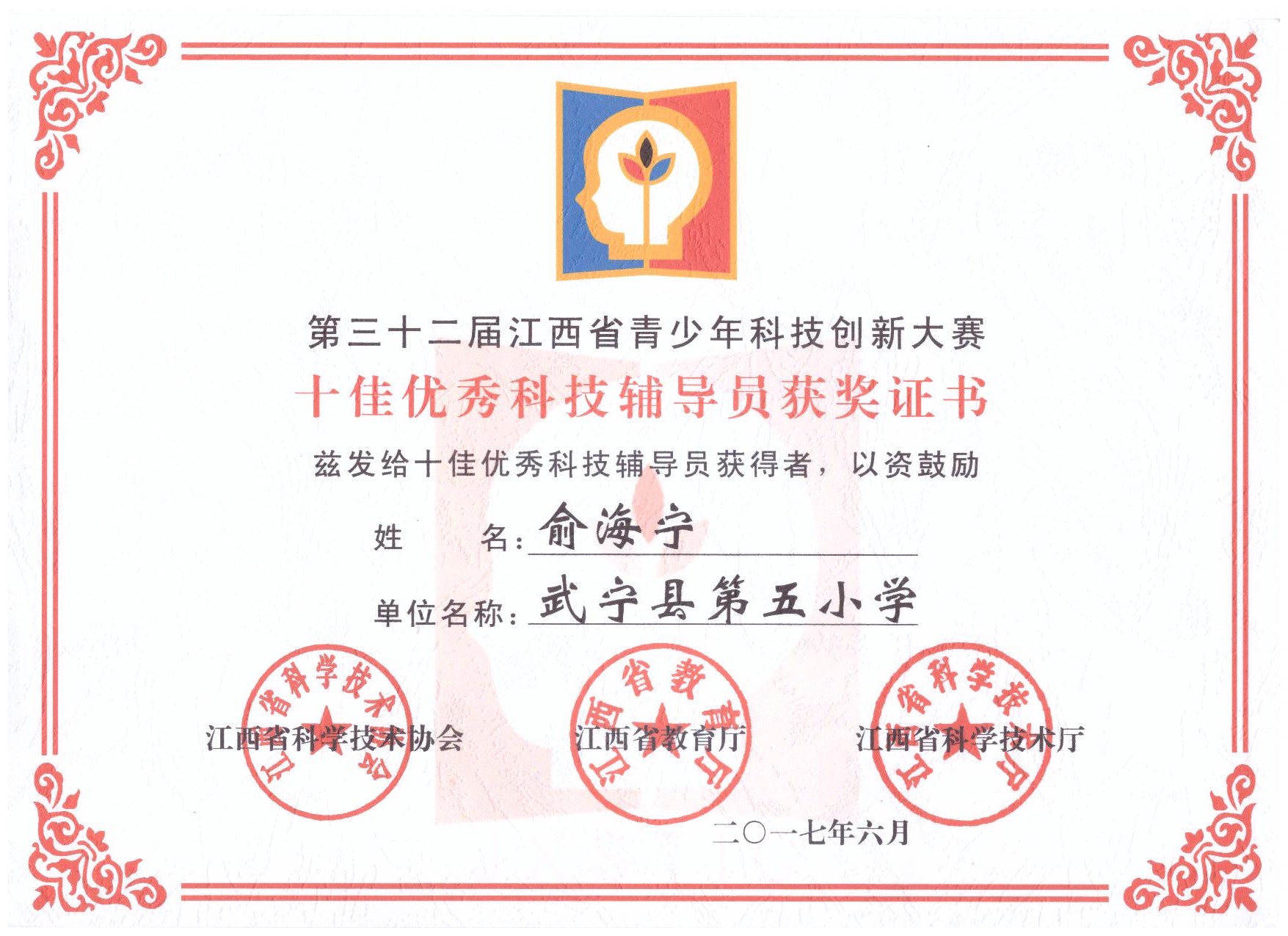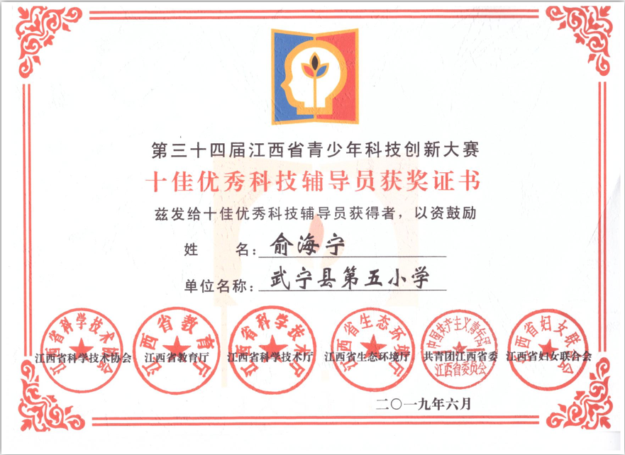 ・2012.8~2021.8江西省青少年科技创新教育十佳科技辅导员