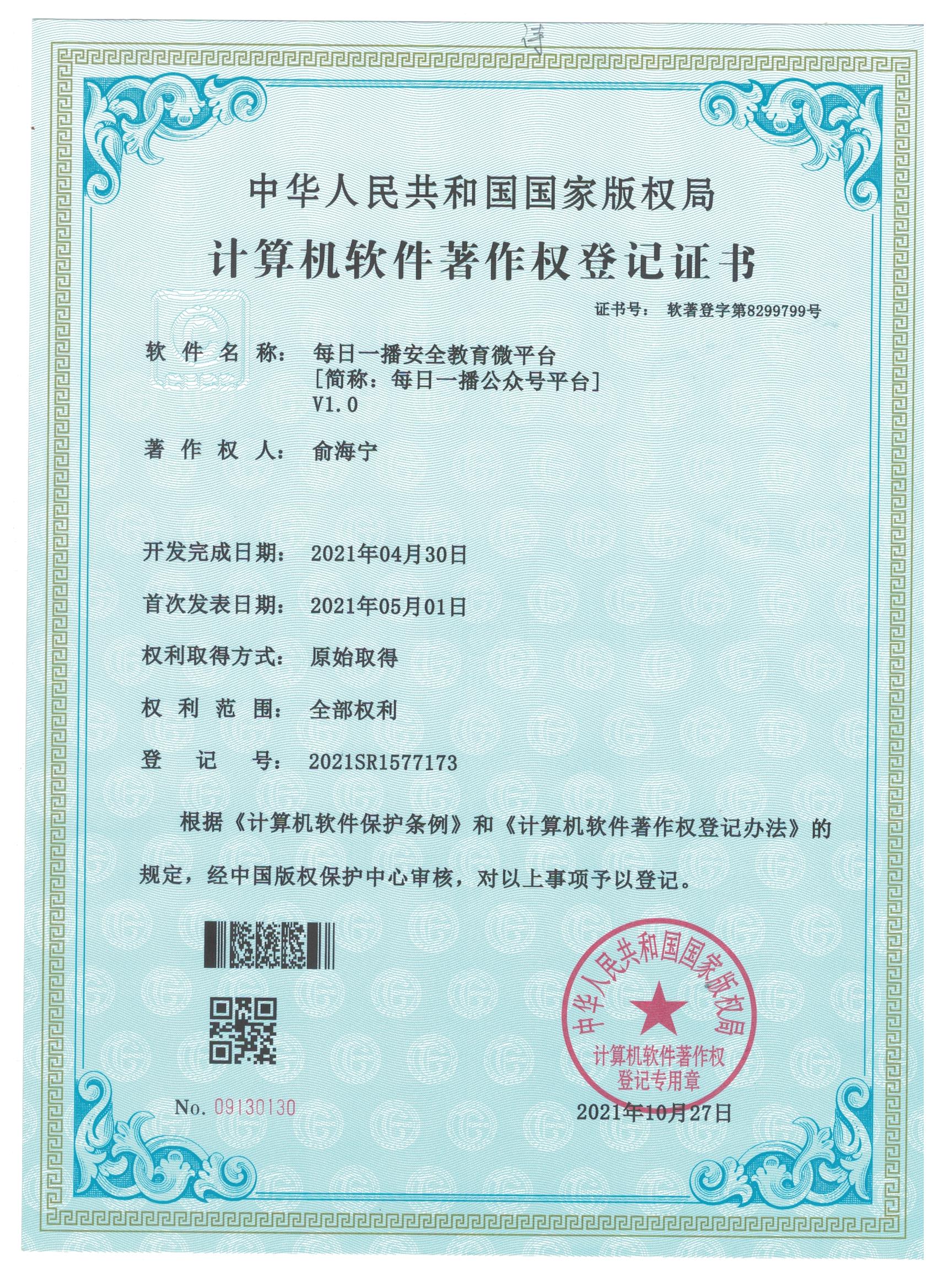 每 日 一 播 由 本 人 自 己 研 发 , 并 取 得 了 国 家 著 作 权 证 , 无 任 何 知 识 产 权 纠 纷 。 每 日 一 播 具 备 全 国 各 省 各 地 使 用 的 接 口 , 如 能 在 全 国 范 围 内 得 到 推 广 应 用 , 可以发挥更大的效用,保护更多的学生和家庭。